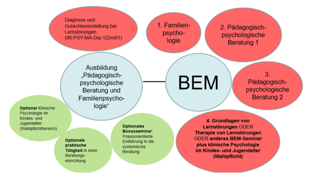Verpflichtend (= rot) sind fünf Lehrveranstaltungen mit je 2 SWS (4 MA-BEM-Module, ein 06-PSY-DIA Seminar), studierbar in zwei Semestern (jährlicher Turnus). Grün = zusätzlich empfohlen.